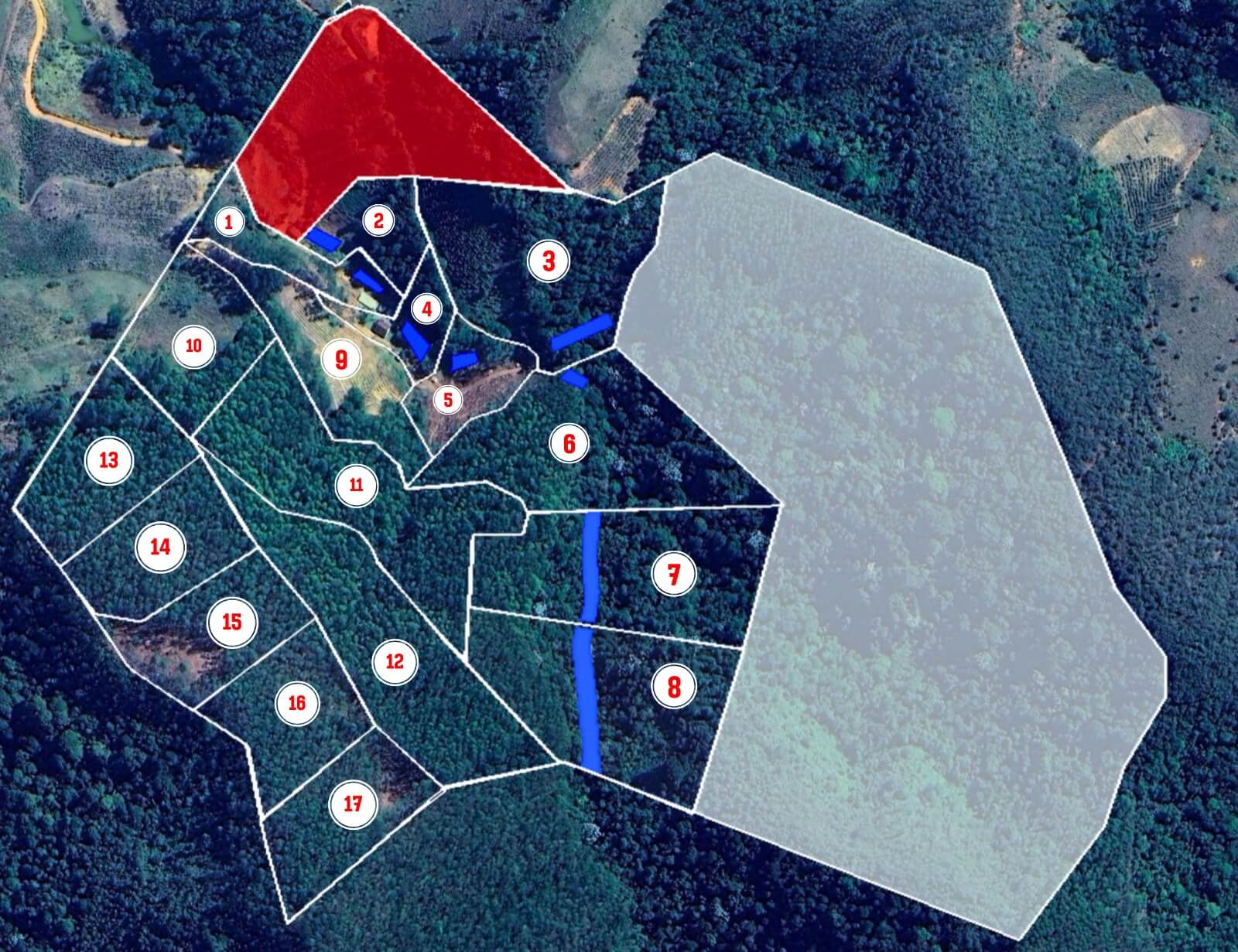 Os sítios já possuem infraestrutura básica pronta, como platôs para construção, pontos de água individuais e rede elétrica na porta.